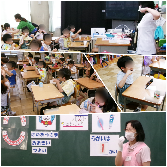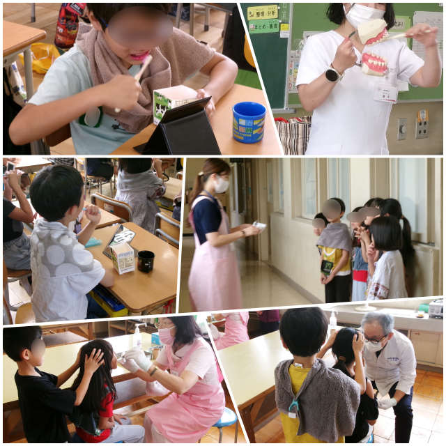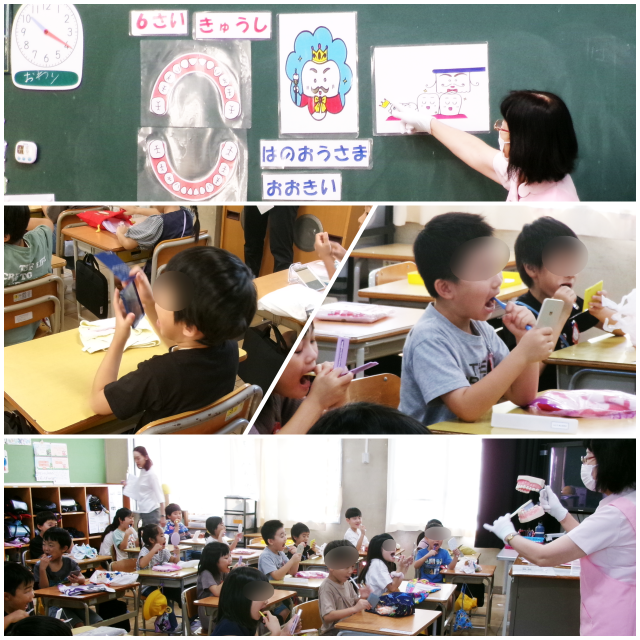 1・2・3年生が対象でしたが、それぞれの学年では、歯科衛生士さんから「六歳臼歯」の磨き方を教えていただいたり、歯を染め出したあとに歯磨きを実際に行って全体の流れや自分が磨き残しやすい箇所を確認したり、部位によって手の向きを変えるとよいことなどを教えていただいたりしていました。