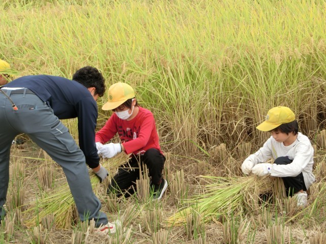 初めての稲刈りでしたが、こつを教わり何度も繰り返すうちに、カマを上手に扱って、スパッと刈れるようになりました。刈った後に藁ひもで結ぶのも一苦労でしたが、どの子も真剣な様子でした。