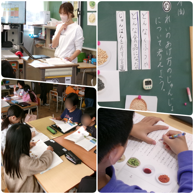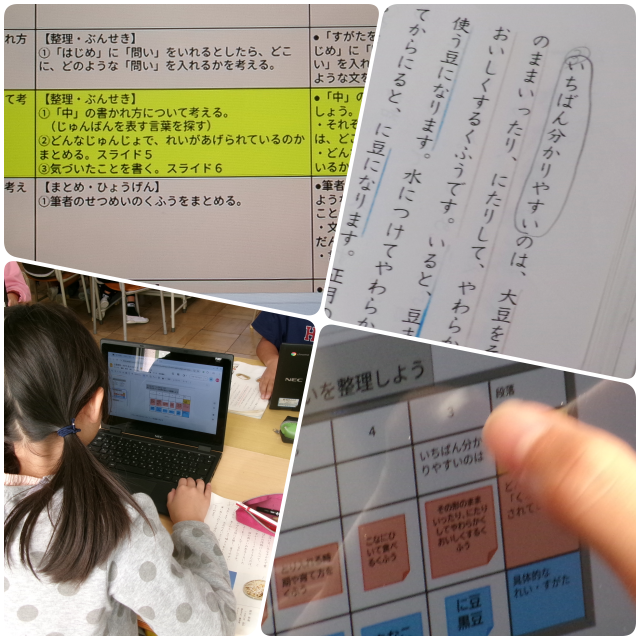 「すがたを変える大豆」という説明文の単元で、子どもたちは「説明をするときに使う、順番を表す言葉」に注目し、「はじめに」「つぎに」「さらに」「また」といった言葉を文中から探したり、どうしてそんな言葉を使うのかを話し合ったりしていました。