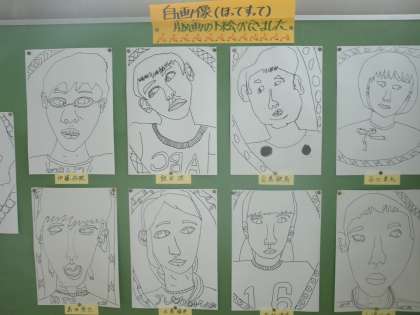 「名作」という習字と版画に彫る「自画像」の下書きが、2階から3階にいく踊り場に掲示してあります。