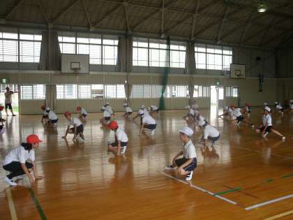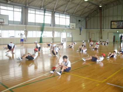 今日は、雨が降りそうな天気でしたので、体育館で練習しました。まず、準備運動です。