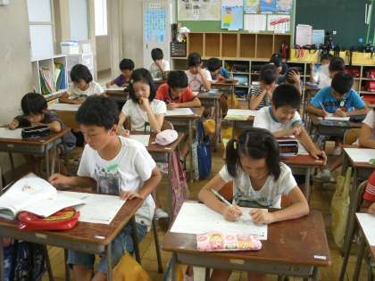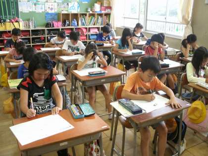3年生が、算数の時間に、「あまりの出る計算」のプリントをしっかり学習していました。