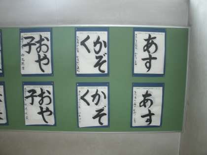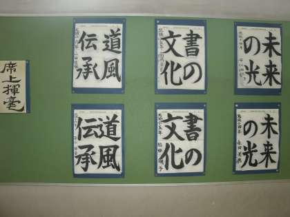 26日に行われる席上揮毫大会に参加する選手の作品が、2階の階段の掲示板に掲示してあります。毎日の練習の成果で、どんどん上手になってきています。