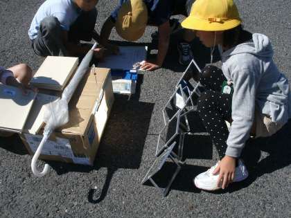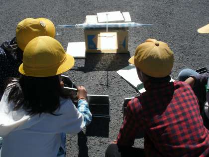 3年生が、理科の授業で、鏡で光を温度計に当てて、温度を測定していました。