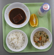 麦ごはん 牛乳 豚丼の具 生揚げのごま味噌かけ オレンジ