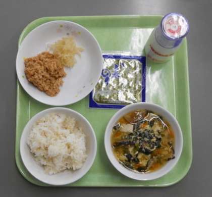 発芽玄米ごはん 牛乳 卵汁(豆腐汁) まぐろの甘辛煮 きざみたくあん 手巻きのり