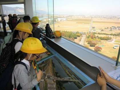 展望タワーから輪中の様子を観察し、水屋も見学しました。