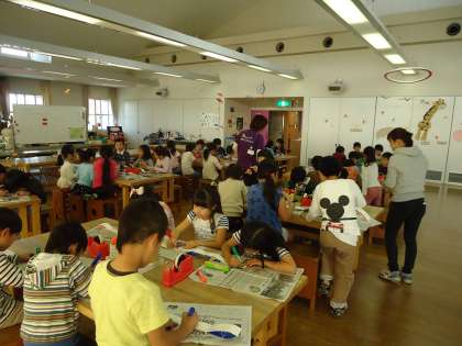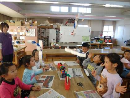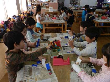 牛乳パックを使った工作にチャレンジしました。飛び出すしかけのある、へびのおもちゃです。係の方の説明を聞き、一生けん命に作りました。お土産に持ち帰ったので、ご家庭でも遊んでみてください。