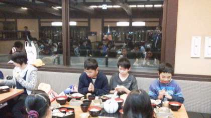 お土産タイムをどの班も時間を守って、終えました。これから夕食です。窓から京都タワーがきれいに見えています。