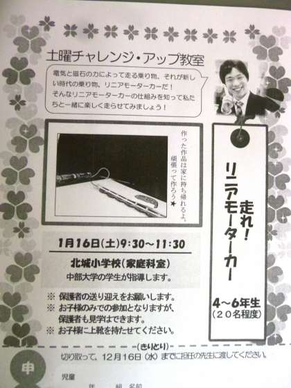 土曜チャレンジアップ教室の案内1 公開日 2015/12/11 更新日 2015/12/11 学校の窓 1/16の土曜日は、話題のリニアモーターカーの仕組みを知り、実際に模型を作ります。作品は、家に持ち帰れます。