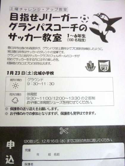 土曜チャレンジアップ教室の案内2 公開日 2015/12/11 更新日 2015/12/11 学校の窓 1/23の土曜日は、名古屋のプロサッカーチームの「グランパス」のコーチから、サッカーを教えてもらえます。初任者にはサッカーの楽しさが、経験者にはプロの技が教えてもらえます。