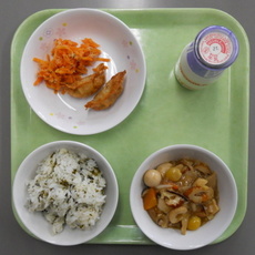 わかめごはん 牛乳 中華海鮮うま煮 ぎょうざ にんじんサラダ