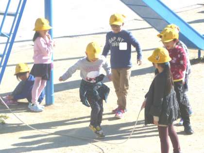 1年生が、なかよく大なわとびをしていました。