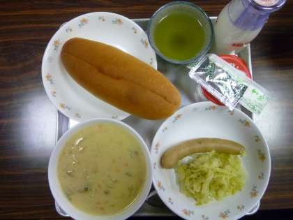 今日の給食 公開日 2015/12/21 更新日 2015/12/21 学校の窓 サンドイッチ ロールパン(小) 牛乳 じゃがいもスープ シェフのフランクフルト ザワークラウト チョコレートケーキまたはいちごムース