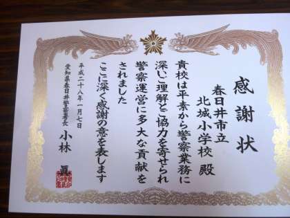本校の「止まってくれて、ありがとう」運動に対して、春日井警察署から、表彰されました。