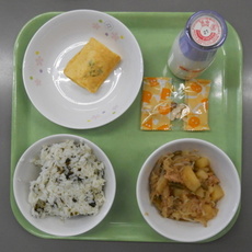 わかめごはん 牛乳 ツナじゃが ねぎ入り卵焼き ミックスナッツ