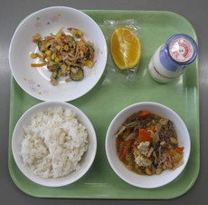 麦ごはん 牛乳 牛肉とたまねぎのうま煮 切り干し大根とツナのサラダ オレンジ