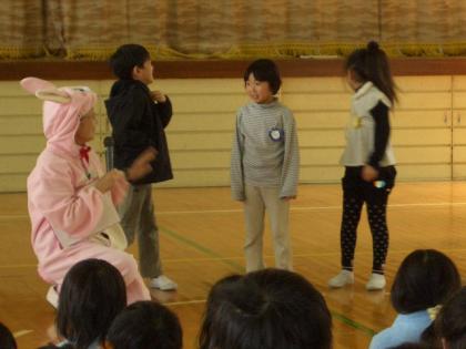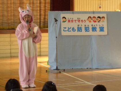 子ども防犯教室 1年 1 公開日 2008/11/21 更新日 2008/11/21 学校行事 ボニターの皆さんによる子ども防犯教室が行われました。 子どもたちは、ウサギ先生や博士などに扮したボニターに方々の名演技に見入っていました。