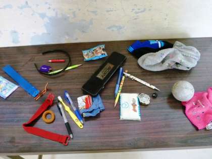 最近の落し物が、昇降口前にならべてあります。