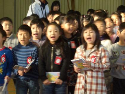 「地球が教室」と「がけの上のポニョ」を歌いました。 元気の良い歌声が体育館に響いていました。
