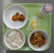 麦ごはん 牛乳 生揚げの中華煮 いかフリッター 冷凍りんご
