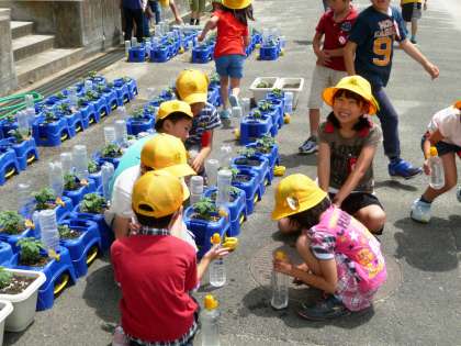 2年生は、自分が育てているミニトマトに水やりをしていました。
