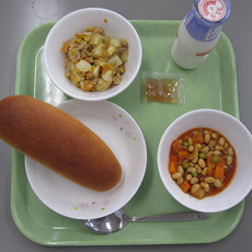 ミルクロールパン 牛乳 ポークビーンズ コロコロポテトサラダ いちじくジャム