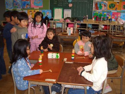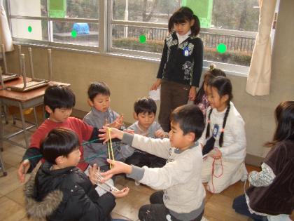 1,2年生活科 昔遊び 2 公開日 2009/01/19 更新日 2009/01/19 学年 2年生は、こままわし、おはじき、けん玉、だるま落とし、あやとり、お手玉の6つののうち、得意な1つの遊びの係りになり、グループに分かれてやってきた1年生に丁寧に教えていました。 2年生に教えてもらって初めてこままわしができた子もいて、とても喜んでいました。