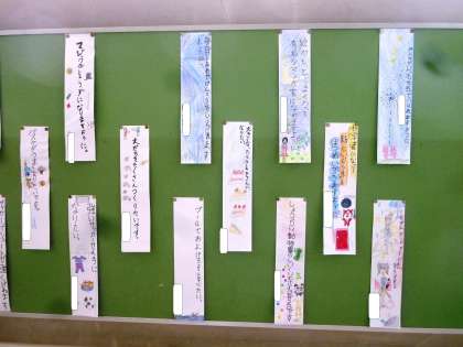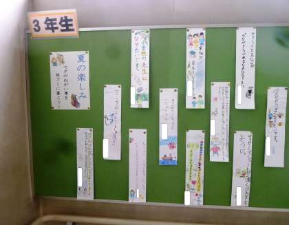 東階段に、3年生の短冊が掲示してあります。