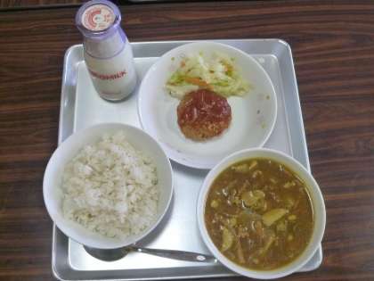 本日の献立は、牛乳、麦ご飯、とうがんのカレースープ、ハンバーグのトマトソースかけ、ボイル野菜