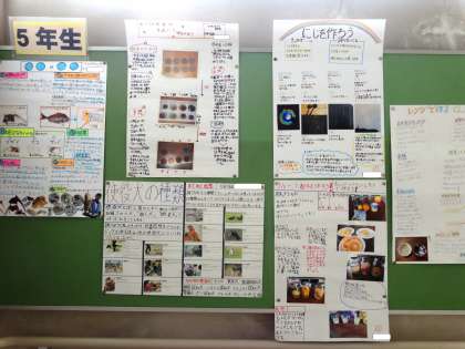 東階段に、5年生の自由研究が掲示してあります。