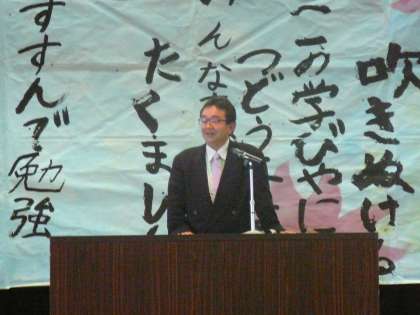 今飯田校長先生と谷口先生がお別れの言葉を言われました。2年〜6年生で心を込めて、