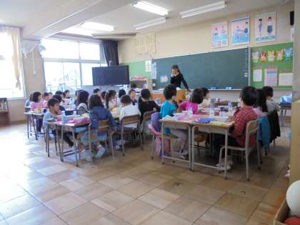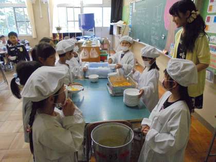 1年生は今日から給食が始まりました。上手に準備ができました。