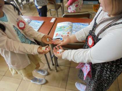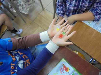 手の中に隠れている数を当てます。左右で合わせると5つです。