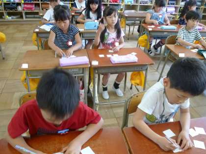 1の1は、算数の授業で、10を作る数当てゲームをするために、カードに数字を書いていました。
