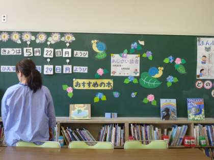 図書整備ボランティアの方が、見えました。アジサイ読書週間のポスターや色紙で作ったかわらしい飾りを掲示したり、本の整頓をしてくださいました。ありがとうございました。