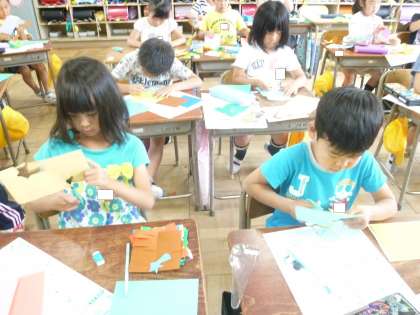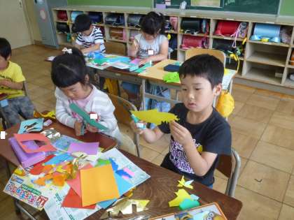 1の1は、図工の授業で、はさみを使っていろいろな飾りを作っていました。