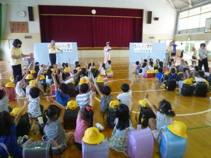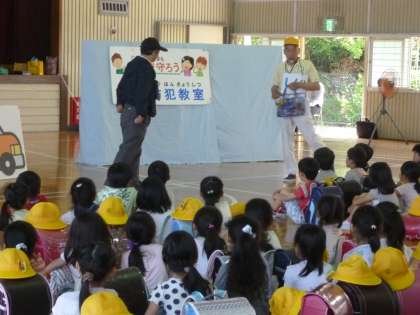 こども防犯教室(1年) 公開日 2017/05/30 更新日 2017/05/30 学校行事 1年生は、体育館で「こども防犯教室」の授業を受けました。「自分の身は自分で守る」ためにどうしたらよいかを寸劇を通して、教えていただきました。