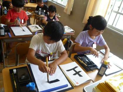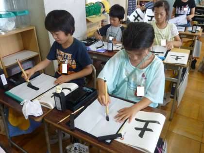 3の3は、書道の時間で、「土」という字を書いていました。バランスよく書けるように練習していました。