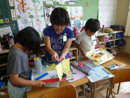 4の3は、図工の時間に友達の作った作品で遊びながら、鑑賞会をしていました。