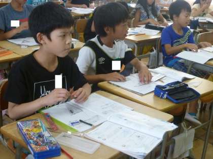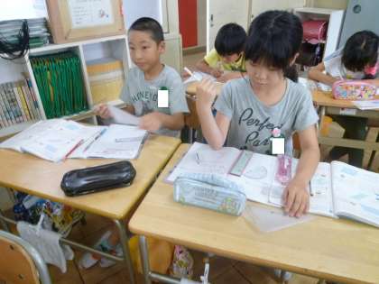 4の2は、算数の時間に、定規や分度器を使って三角形をかいていました。
