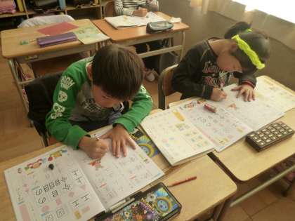2の1は、書写で鉛筆で年賀状の書き方を練習していました。