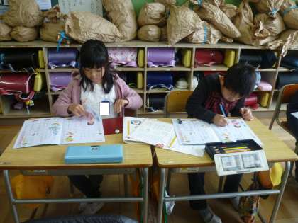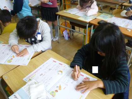 2の2は、書道の時間に年賀状の書き方を練習していました。