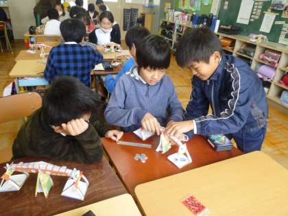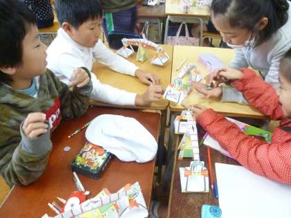 3の3は、算数で紙の天秤を使って、重さ調べをしていました。
