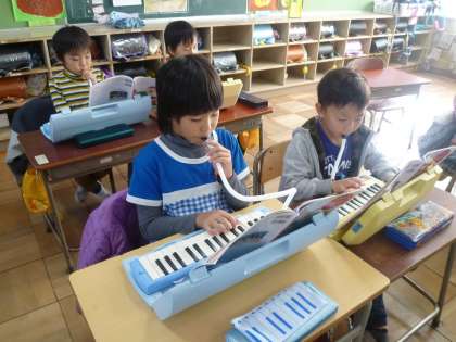 1の1は、音楽で、鍵盤ハーモニカの練習をしていました。