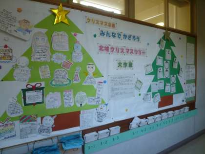 図書室前の掲示板には、図書委員や図書室の本を読んだ子どもたちが、他の人に薦めたい本の紹介カードを、図書委員が作ってくれたクリスマスツリーの壁紙に貼っています。
