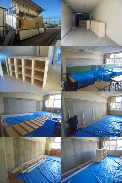 新しいロッカーに取り換え中。寒い中、早朝から工事をしてくださっています。少し大きくなってランドセルが入れやすくなります。1,2年生の皆さん、3学期が楽しみですね。