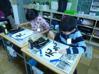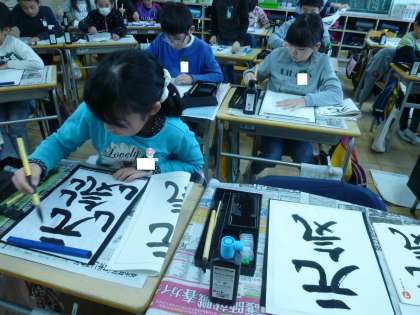4の2は、書道で「元気」の文字を練習していました。