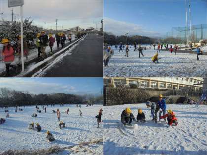 朝から笑顔で登校。子どもたちは雪を見ると元気になりますね。