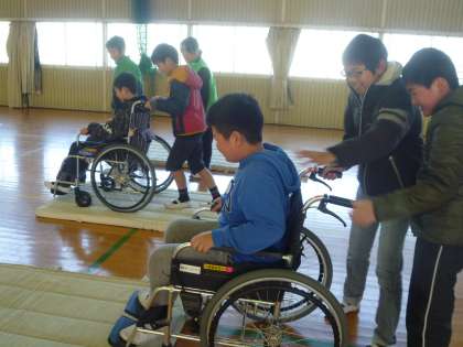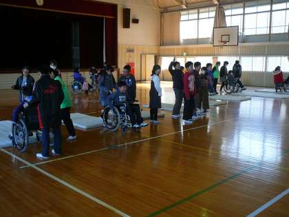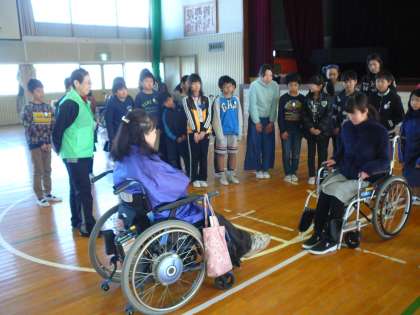 2月14日、体育館で5年生が車椅子を使用して見える方を講師に迎えて、お話を聞き、実際に車椅子を体験しました。